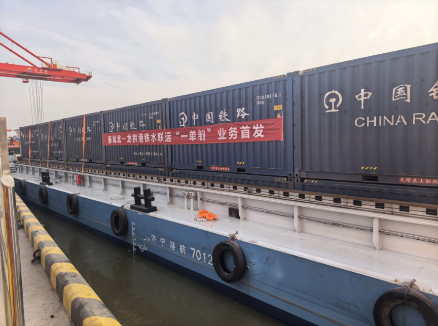 今年5月,公司通过深入考察交流、推理、洽谈和业务衔接,与济南铁路物流中心、济宁龙拱港有限公司合作首推新能源电车-铁路-船运多式联运一单制运输模式试运行,并于12月10日铁路集装箱到达龙拱港下水装船运行。